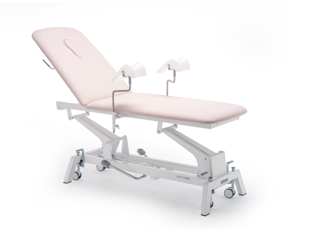 Dwuczęściowy stół do badań i zabiegów z długą sekcją zagłówka.