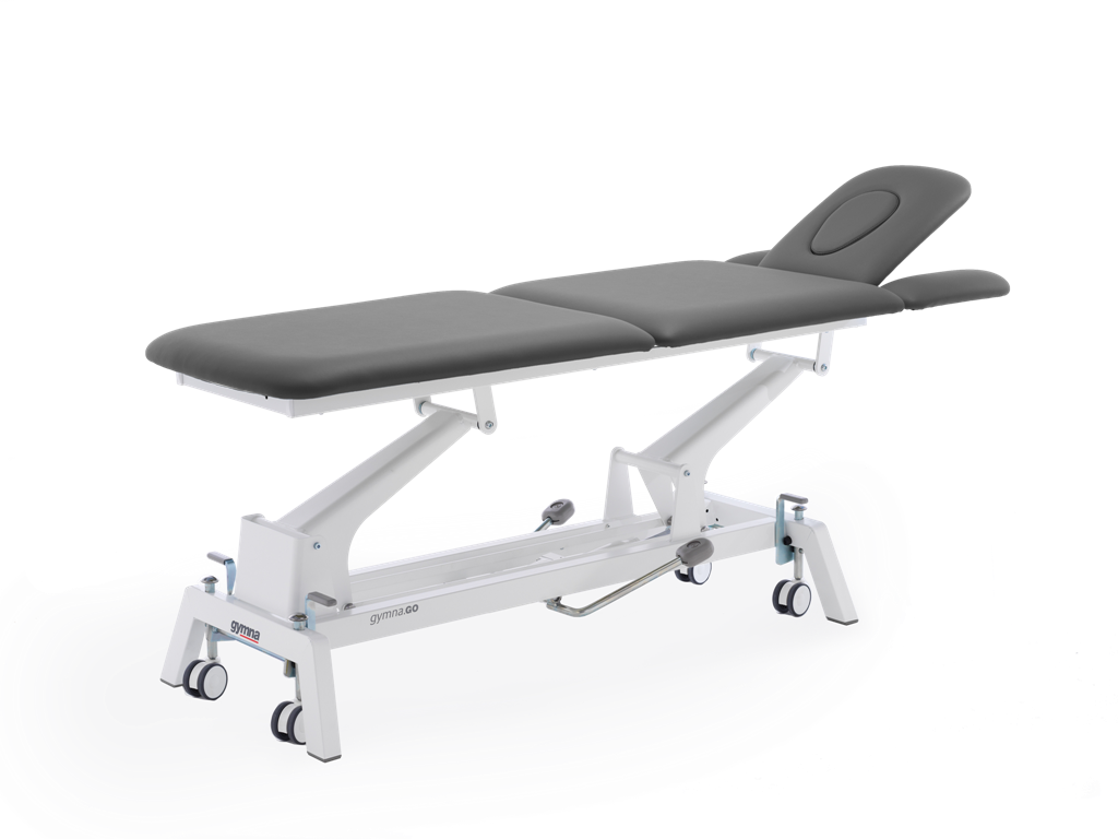 Wysokiej klasy, trójsegmentowy stół do leczenia i masażu, z podgłówkiem regulowanym za pomocą sprężyny gazowej, w zakresie od -72o do +30o i regulowanymi podłokietnikami, oraz regulowaną częścią nożną w zakresie od 0o do +80o.