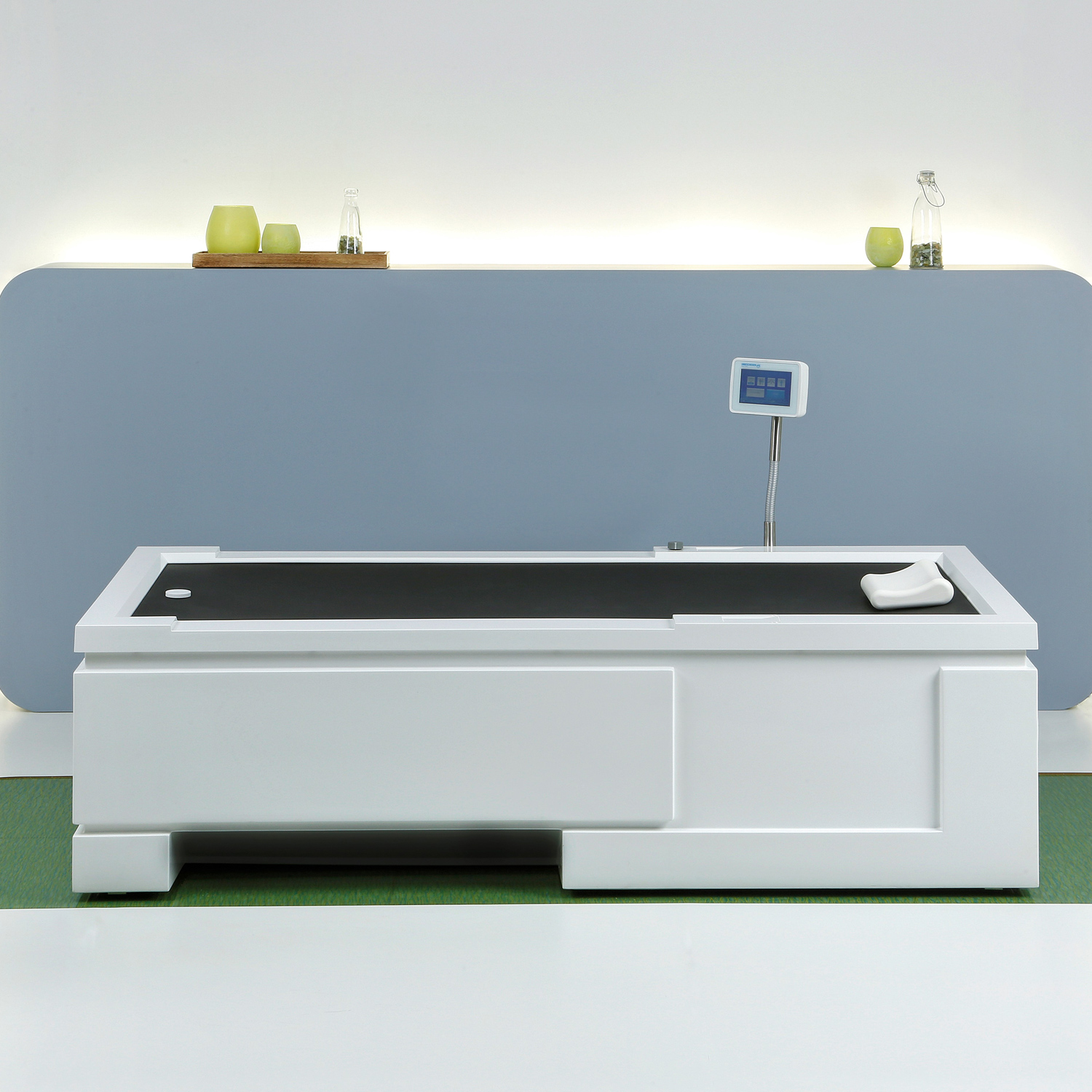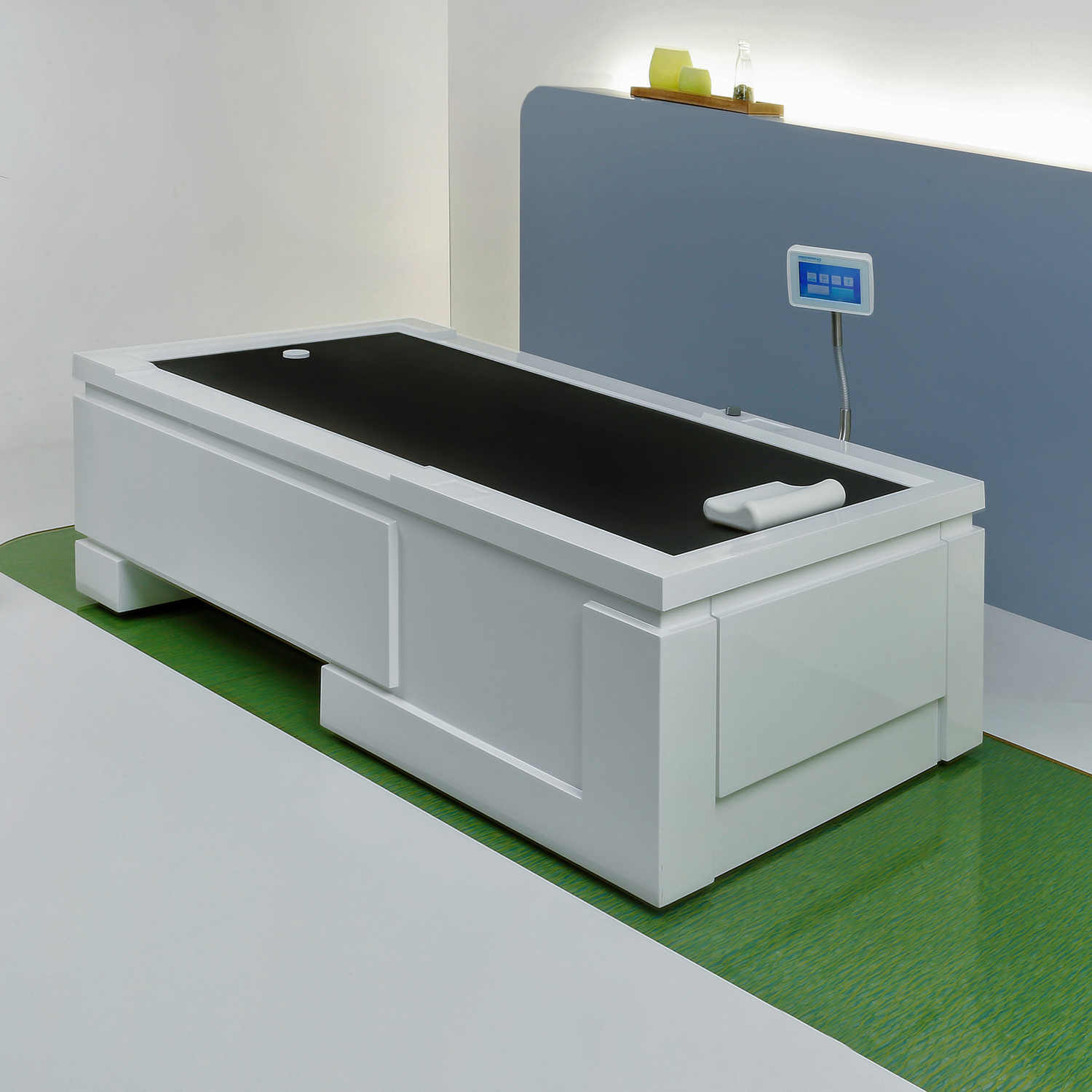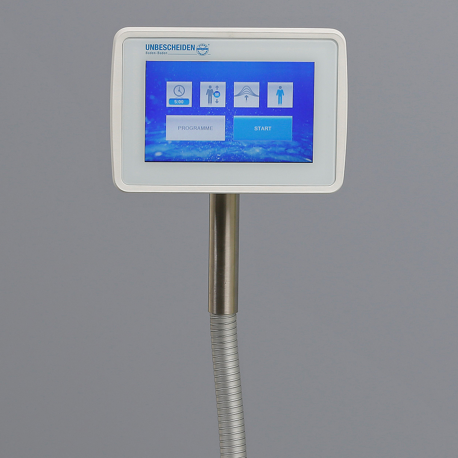 i zejście z urządzenia. System ciśnieniowych dyszy natryskowych, ukrytych pod membraną, zasilany jest poprzez elektronicznie sterowany system rozdzielczy.W celu regulacji temperatury wody zostały w urządzenie wbudowane systemy podgrzewania lub chłodzenia. Sterowanie urządzeniem odbywa się za pomocą sterownika z ekranem dotykowym. Medyjet posiada możliwość stosowania gotowych lub indywidualnie regulowanych programów zabiegowych.