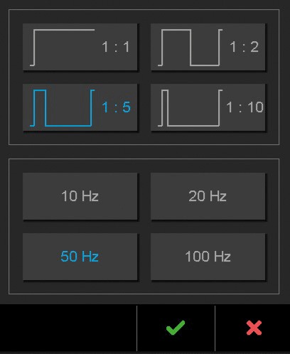 ciągła impulsowa, regulowana częstotliwość 10 Hz, 20 Hz, 50 Hz, 100 Hz cykle pracy: 1:1, 1:2, 1:5, 1:10 |